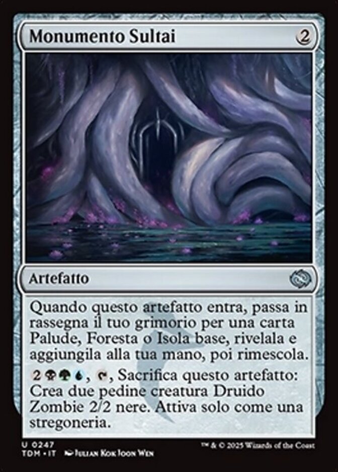 | Rules | When this artifact enters, search your library for a basic Swamp, Forest, or Island card, reveal it, put it into your hand, then shuffle. , , Sacrifice this artifact: Create two 2/2 black Zombie Druid creature tokens. Activate only as a sorcery. |