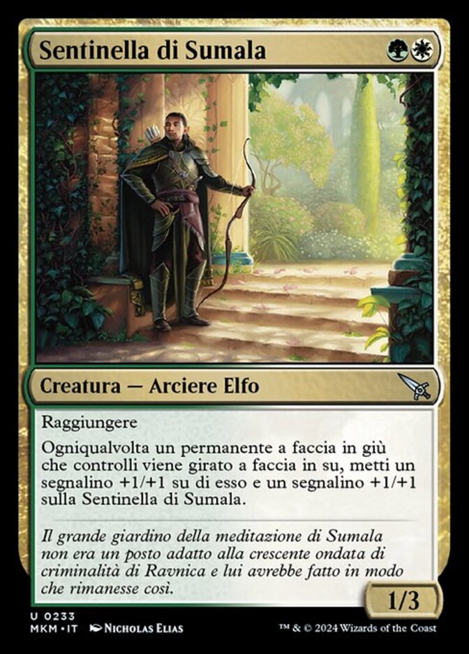 | Rules | Reach Whenever a face-down permanent you control is turned face up, put a +1/+1 counter on it and a +1/+1 counter on Sumala Sentry. |
