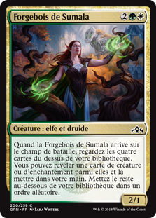| Rules | When Sumala Woodshaper enters the battlefield, look at the top four cards of your library. You may reveal a creature or enchantment card from among them and put it into your hand. Put the rest on the bottom of your library in a random order. |
