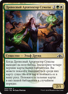 | Rules | When Sumala Woodshaper enters the battlefield, look at the top four cards of your library. You may reveal a creature or enchantment card from among them and put it into your hand. Put the rest on the bottom of your library in a random order. |