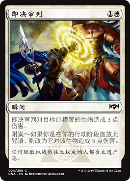 | Rules | Summary Judgment deals 3 damage to target tapped creature. Addendum — If you cast this spell during your main phase, it deals 5 damage instead. |