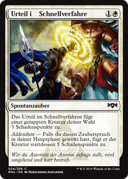 | Rules | Summary Judgment deals 3 damage to target tapped creature. Addendum — If you cast this spell during your main phase, it deals 5 damage instead. |