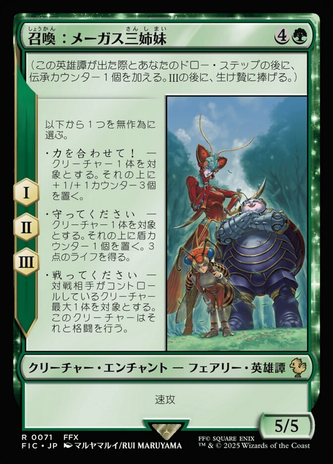 | Rules | (As this Saga enters and after your draw step, add a lore counter. Sacrifice after III.) I, II, III — Choose one at random — • Combine Powers! — Put three +1/+1 counters on target creature. • Defense! — Put a shield counter on target creature. You gain 3 life. • Fight! — This creature fights up to one target creature an opponent controls. Haste |