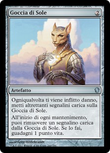 | Rules | Whenever you're dealt damage, put that many charge counters on Sun Droplet. At the beginning of each upkeep, you may remove a charge counter from Sun Droplet. If you do, you gain 1 life. |