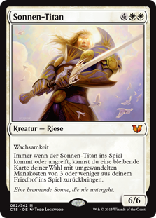 | Rules | Vigilance Whenever Sun Titan enters the battlefield or attacks, you may return target permanent card with mana value 3 or less from your graveyard to the battlefield. |