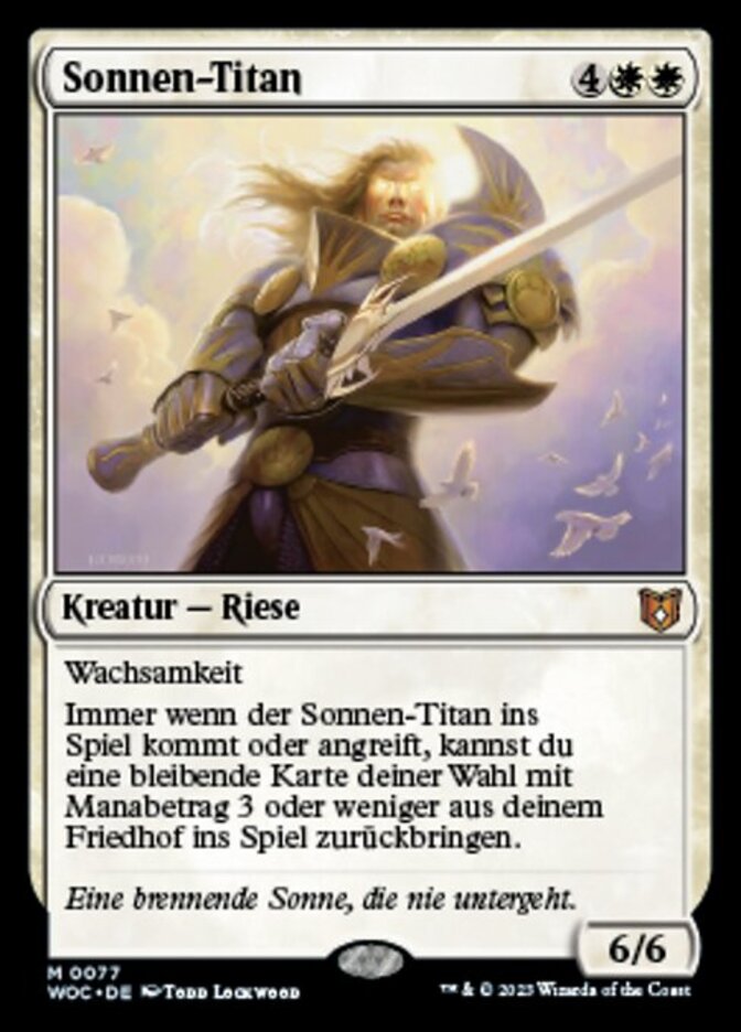 | Rules | Vigilance Whenever Sun Titan enters the battlefield or attacks, you may return target permanent card with mana value 3 or less from your graveyard to the battlefield. |
