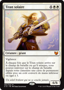 | Rules | Vigilance Whenever Sun Titan enters the battlefield or attacks, you may return target permanent card with mana value 3 or less from your graveyard to the battlefield. |