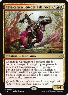 Rules When Sun-Blessed Mount enters the battlefield, you may search your library and/or graveyard for a card named Huatli, Dinosaur Knight, reveal it, then put it into your hand. If you searched your library this way, shuffle.
