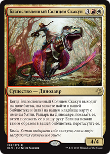 | Rules | When Sun-Blessed Mount enters the battlefield, you may search your library and/or graveyard for a card named Huatli, Dinosaur Knight, reveal it, then put it into your hand. If you searched your library this way, shuffle. |