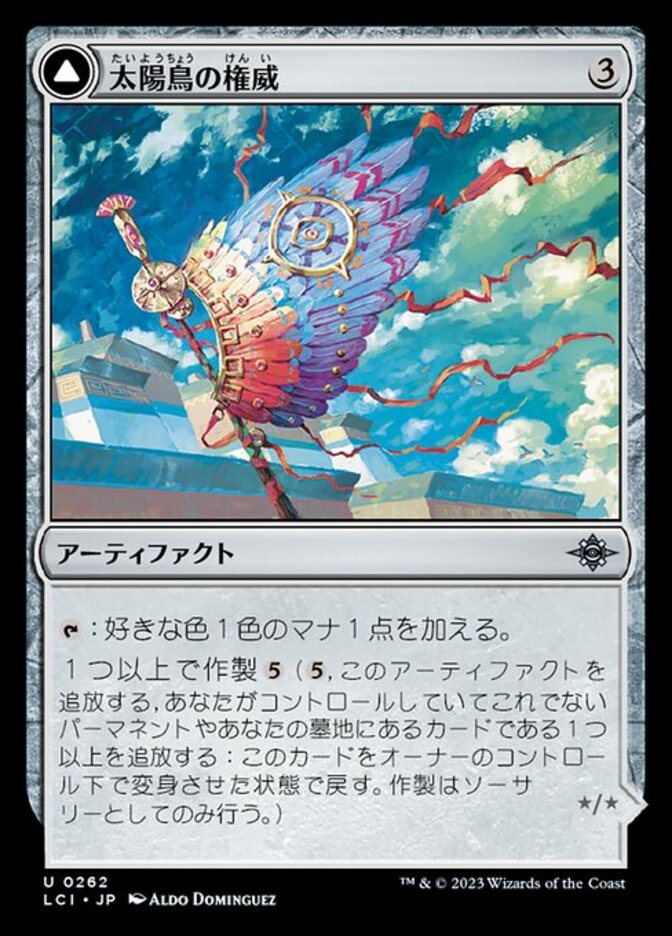 | Rules | : Add one mana of any color. Craft with one or more (, Exile this artifact, Exile one or more other permanents you control and/or cards from your graveyard: Return this card transformed under its owner's control. Craft only as a sorcery.) // Flying, vigilance, haste Sunbird Effigy's power and toughness are each equal to the number of colors among the exiled cards used to craft it. : For each color among the exiled cards used to craft Sunbird Effigy, add one mana of that color. |