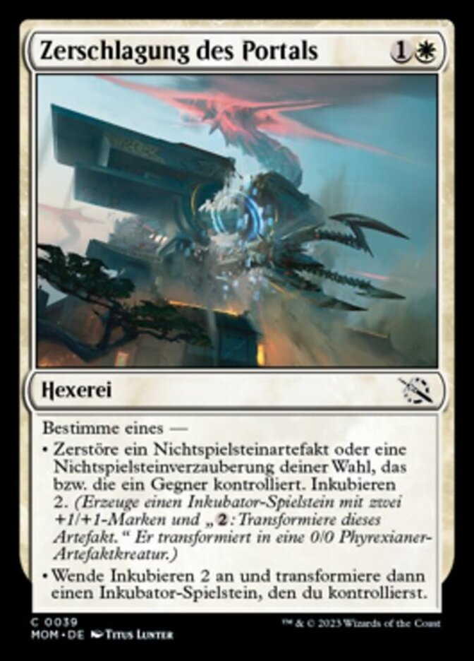 | Rules | Choose one — • Destroy target nontoken artifact or enchantment an opponent controls. Incubate 2. (Create an Incubator token with two +1/+1 counters on it and ": Transform this artifact." It transforms into a 0/0 Phyrexian artifact creature.) • Incubate 2, then transform an Incubator token you control. |