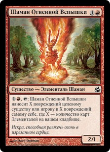 | Rules | , : Sunflare Shaman deals X damage to any target and X damage to itself, where X is the number of Elemental cards in your graveyard. |