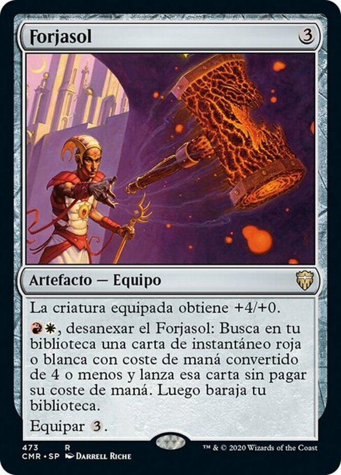 | Rules | Equipped creature gets +4/+0. , Unattach Sunforger: Search your library for a red or white instant card with mana value 4 or less and cast that card without paying its mana cost. Then shuffle. Equip |