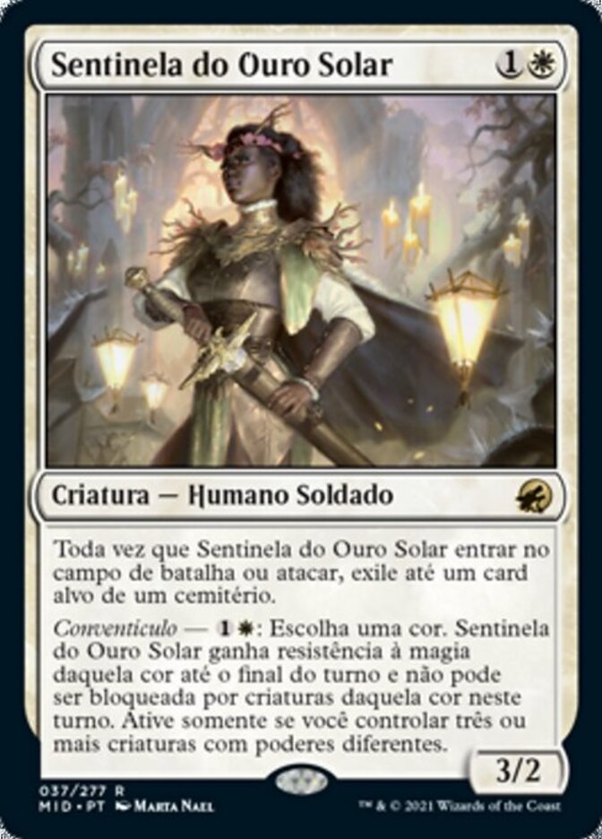 | Rules | Whenever Sungold Sentinel enters the battlefield or attacks, exile up to one target card from a graveyard. Coven — : Choose a color. Sungold Sentinel gains hexproof from that color until end of turn and can't be blocked by creatures of that color this turn. Activate only if you control three or more creatures with different powers. |