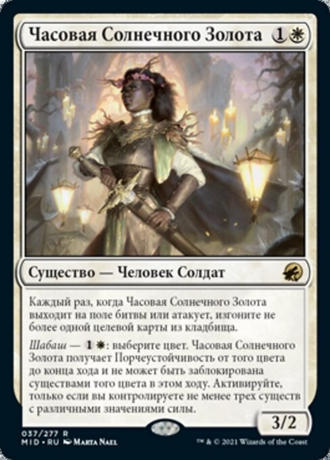 | Rules | Whenever Sungold Sentinel enters the battlefield or attacks, exile up to one target card from a graveyard. Coven — : Choose a color. Sungold Sentinel gains hexproof from that color until end of turn and can't be blocked by creatures of that color this turn. Activate only if you control three or more creatures with different powers. |