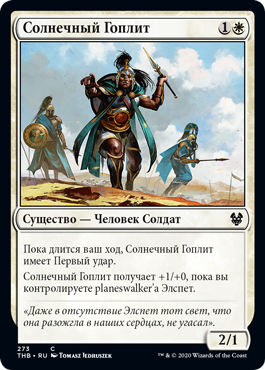 | Rules | As long as it's your turn, Sunlit Hoplite has first strike. Sunlit Hoplite gets +1/+0 as long as you control an Elspeth planeswalker. |