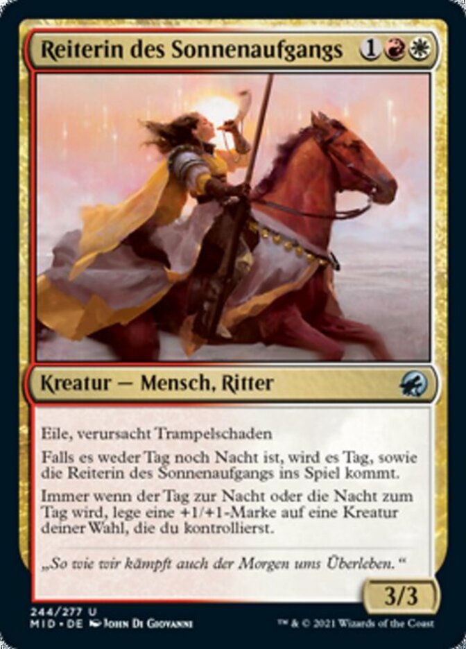 Languages Sunrise Cavalier 日昇騎兵 日升骑兵 Cavaliera dell'Aurora 日の出の騎兵 Jinete del amanecer Amazona da Aurora 일출의 기수 Cavalière de l'aurore Reiterin des Sonnenaufgangs Всадница Восхода