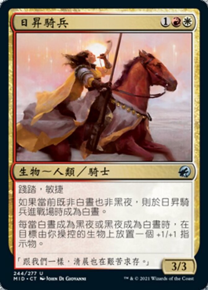 | Rules | Trample, haste If it's neither day nor night, it becomes day as Sunrise Cavalier enters the battlefield. Whenever day becomes night or night becomes day, put a +1/+1 counter on target creature you control. |