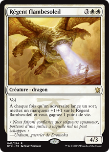 | Rules | Flying Whenever an opponent casts a spell, put a +1/+1 counter on Sunscorch Regent and you gain 1 life. |