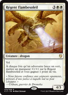| Rules | Flying Whenever an opponent casts a spell, put a +1/+1 counter on Sunscorch Regent and you gain 1 life. |