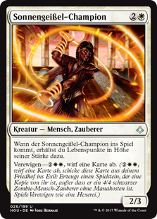 | Rules | When Sunscourge Champion enters the battlefield, you gain life equal to its power. Eternalize—, Discard a card. (, Discard a card, Exile this card from your graveyard: Create a token that's a copy of it, except it's a 4/4 black Zombie Human Wizard with no mana cost. Eternalize only as a sorcery.) |
