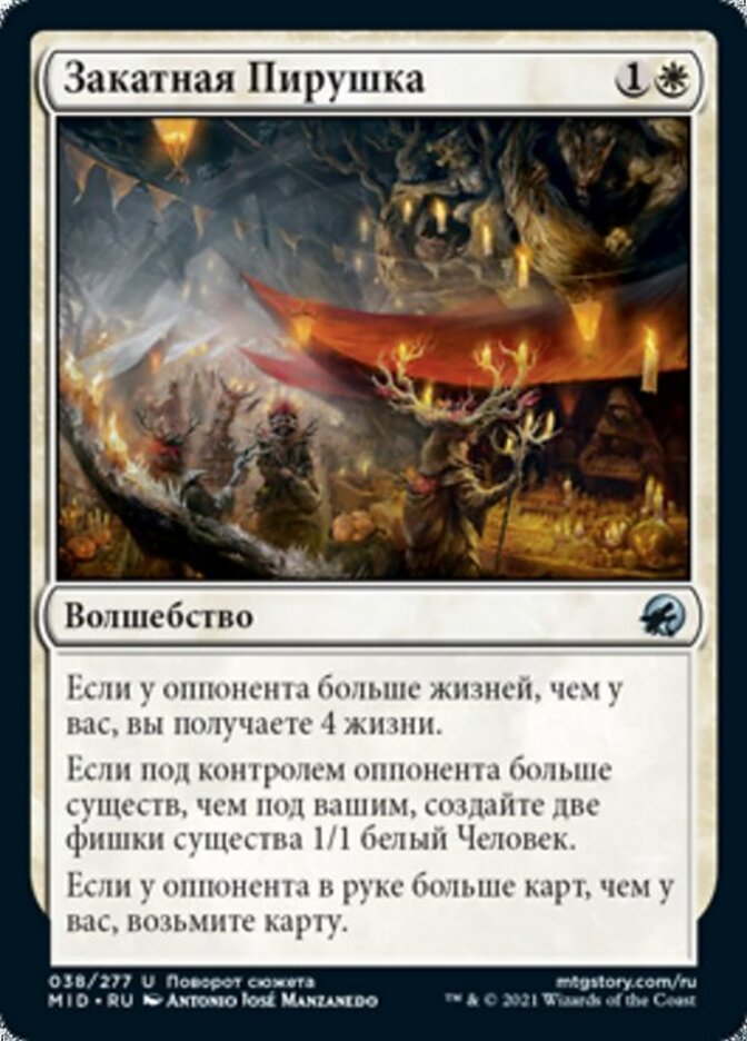| Rules | If an opponent has more life than you, you gain 4 life. If an opponent controls more creatures than you, create two 1/1 white Human creature tokens. If an opponent has more cards in hand than you, draw a card. |