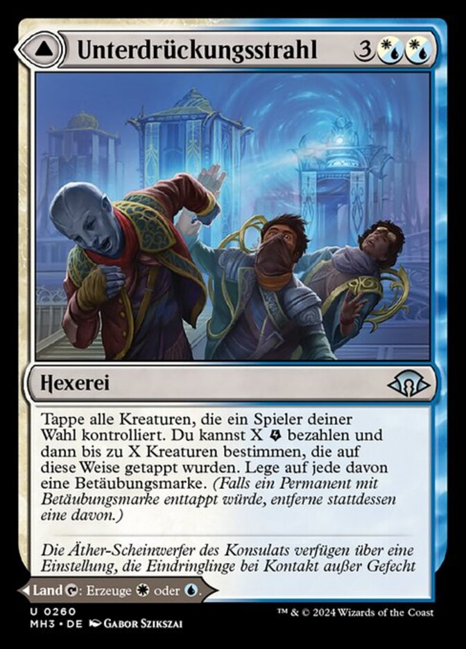 | Rules | Tap all creatures target player controls. You may pay X , then choose up to X creatures tapped this way. Put a stun counter on each of them. (If a permanent with a stun counter would become untapped, remove one from it instead.) // Orderly Plaza enters the battlefield tapped. : Add or . |
