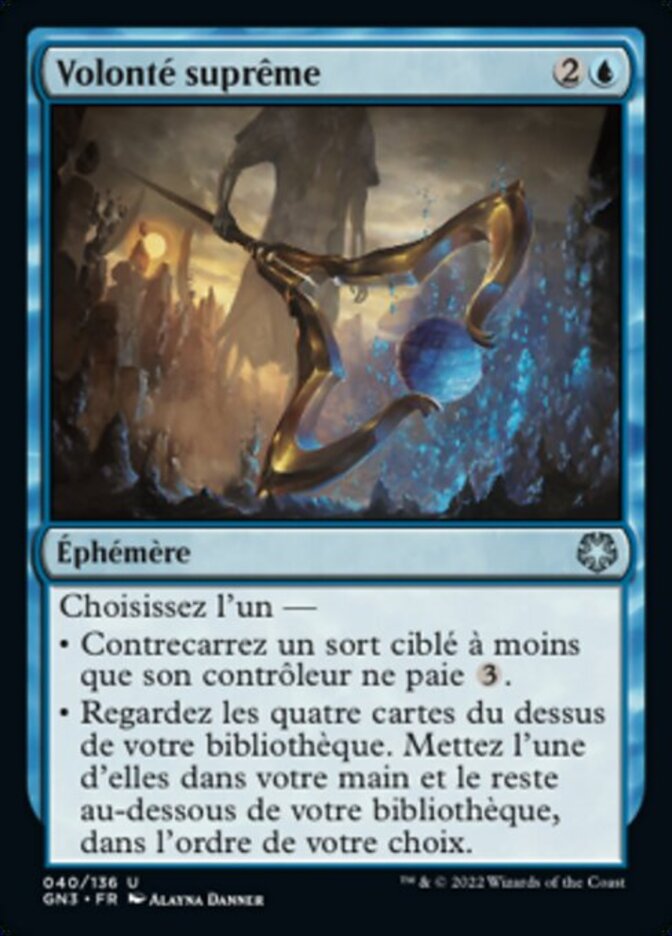 | Rules | Choose one — • Counter target spell unless its controller pays . • Look at the top four cards of your library. Put one of them into your hand and the rest on the bottom of your library in any order. |