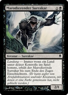 | Rules | Landfall — Whenever a land enters the battlefield under your control, Surrakar Marauder gains intimidate until end of turn. (It can't be blocked except by artifact creatures and/or creatures that share a color with it.) |