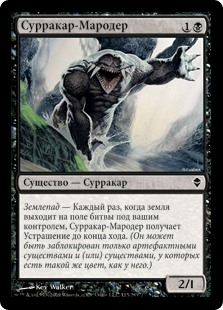 | Rules | Landfall — Whenever a land enters the battlefield under your control, Surrakar Marauder gains intimidate until end of turn. (It can't be blocked except by artifact creatures and/or creatures that share a color with it.) |