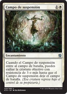 | Rules | When Suspension Field enters the battlefield, you may exile target creature with toughness 3 or greater until Suspension Field leaves the battlefield. (That creature returns under its owner's control.) |