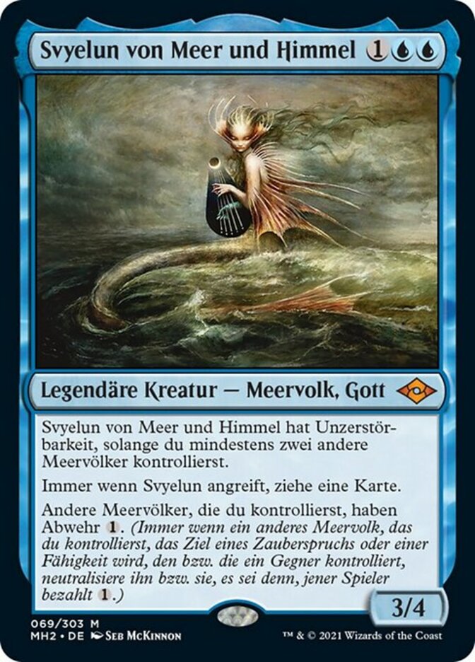 | Rules | Svyelun of Sea and Sky has indestructible as long as you control at least two other Merfolk. Whenever Svyelun attacks, draw a card. Other Merfolk you control have ward . (Whenever another Merfolk you control becomes the target of a spell or ability an opponent controls, counter it unless that player pays .) |