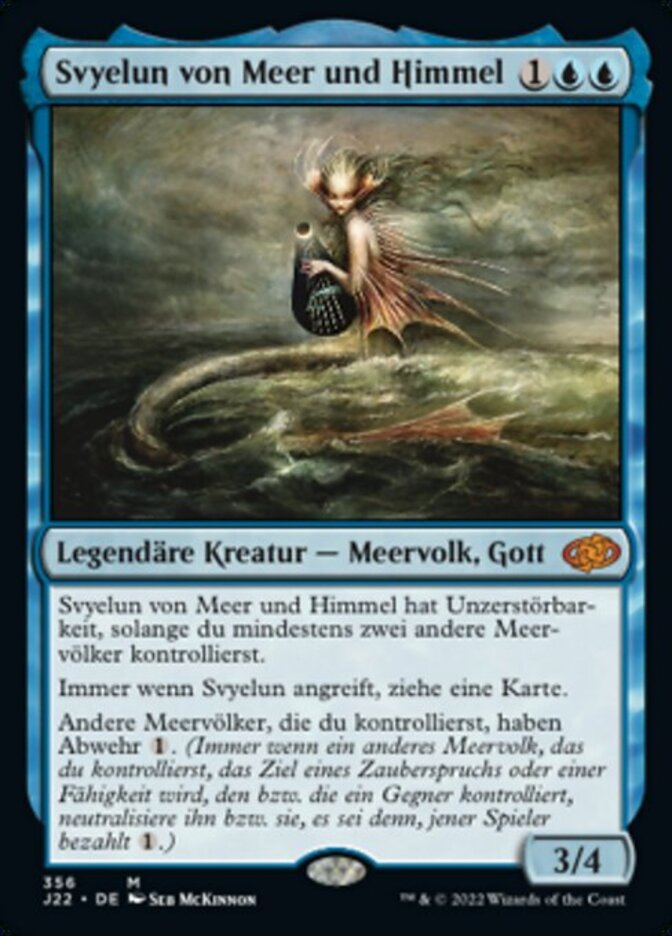 | Rules | Svyelun of Sea and Sky has indestructible as long as you control at least two other Merfolk. Whenever Svyelun attacks, draw a card. Other Merfolk you control have ward . (Whenever another Merfolk you control becomes the target of a spell or ability an opponent controls, counter it unless that player pays .) |