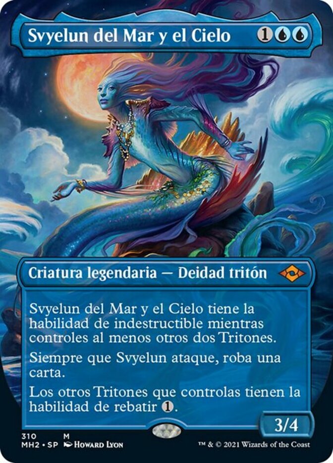 | Rules | Svyelun of Sea and Sky has indestructible as long as you control at least two other Merfolk. Whenever Svyelun attacks, draw a card. Other Merfolk you control have ward . (Whenever another Merfolk you control becomes the target of a spell or ability an opponent controls, counter it unless that player pays .) |