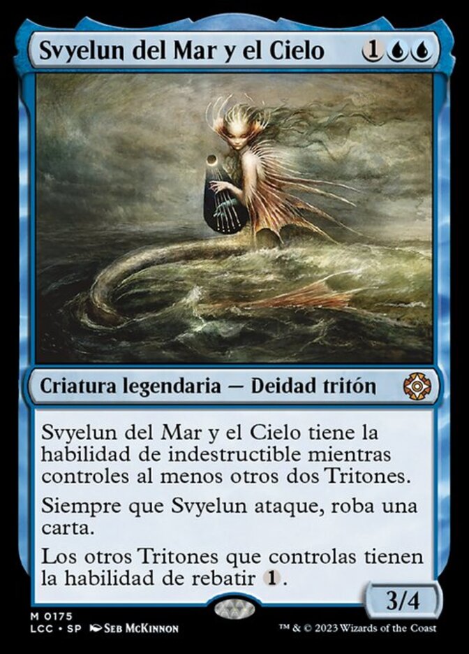 | Rules | Svyelun of Sea and Sky has indestructible as long as you control at least two other Merfolk. Whenever Svyelun attacks, draw a card. Other Merfolk you control have ward . (Whenever another Merfolk you control becomes the target of a spell or ability an opponent controls, counter it unless that player pays .) |