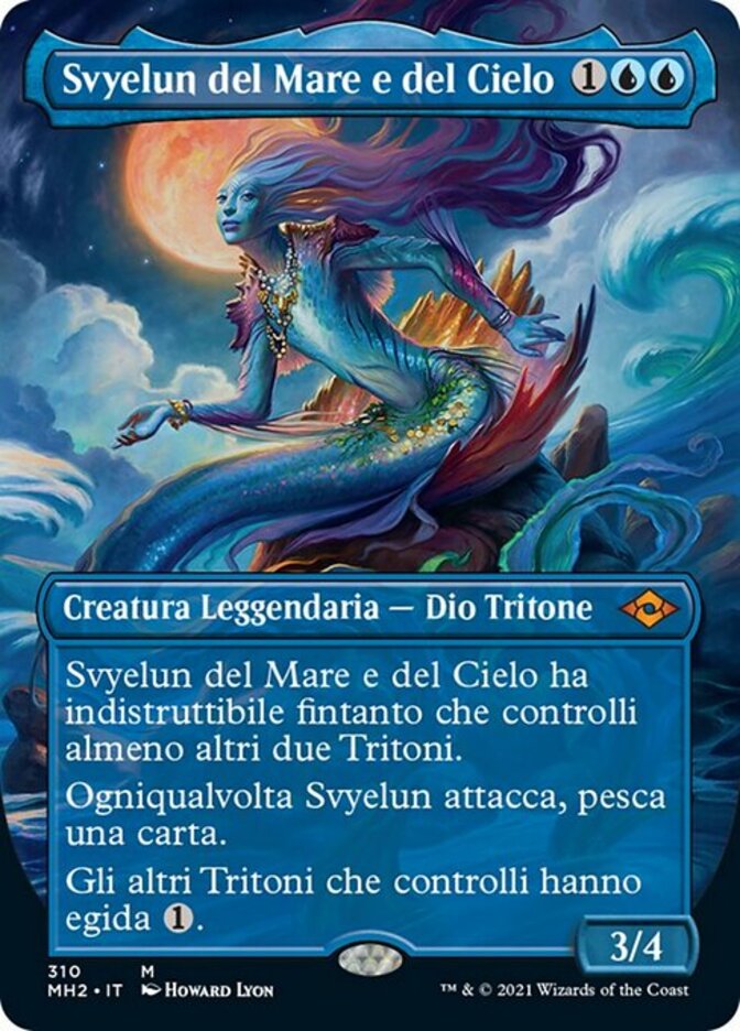 | Rules | Svyelun of Sea and Sky has indestructible as long as you control at least two other Merfolk. Whenever Svyelun attacks, draw a card. Other Merfolk you control have ward . (Whenever another Merfolk you control becomes the target of a spell or ability an opponent controls, counter it unless that player pays .) |