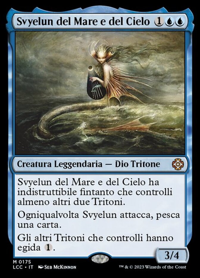 | Rules | Svyelun of Sea and Sky has indestructible as long as you control at least two other Merfolk. Whenever Svyelun attacks, draw a card. Other Merfolk you control have ward . (Whenever another Merfolk you control becomes the target of a spell or ability an opponent controls, counter it unless that player pays .) |