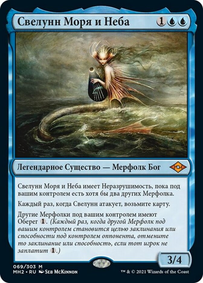 | Rules | Svyelun of Sea and Sky has indestructible as long as you control at least two other Merfolk. Whenever Svyelun attacks, draw a card. Other Merfolk you control have ward . (Whenever another Merfolk you control becomes the target of a spell or ability an opponent controls, counter it unless that player pays .) |