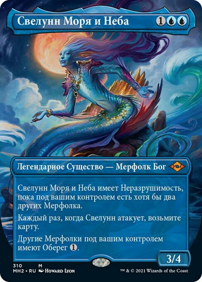 | Rules | Svyelun of Sea and Sky has indestructible as long as you control at least two other Merfolk. Whenever Svyelun attacks, draw a card. Other Merfolk you control have ward . (Whenever another Merfolk you control becomes the target of a spell or ability an opponent controls, counter it unless that player pays .) |