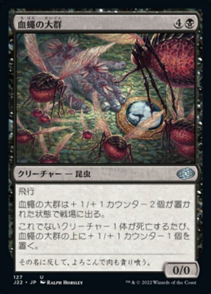 | Rules | Flying Swarm of Bloodflies enters the battlefield with two +1/+1 counters on it. Whenever another creature dies, put a +1/+1 counter on Swarm of Bloodflies. |