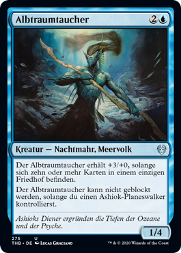 | Rules | Swimmer in Nightmares gets +3/+0 as long as there are ten or more cards in a single graveyard. Swimmer in Nightmares can't be blocked as long as you control an Ashiok planeswalker. |