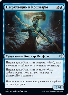 | Rules | Swimmer in Nightmares gets +3/+0 as long as there are ten or more cards in a single graveyard. Swimmer in Nightmares can't be blocked as long as you control an Ashiok planeswalker. |