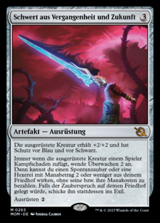 | Rules | Equipped creature gets +2/+2 and has protection from blue and from black. Whenever equipped creature deals combat damage to a player, surveil 2. Then you may cast an instant or sorcery spell with mana value 2 or less from your graveyard without paying its mana cost. If that spell would be put into your graveyard, exile it instead. Equip |