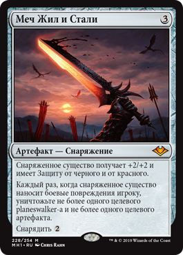 | Rules | Equipped creature gets +2/+2 and has protection from black and from red. Whenever equipped creature deals combat damage to a player, destroy up to one target planeswalker and up to one target artifact. Equip |