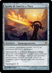 | Rules | Equipped creature gets +2/+2 and has protection from red and from white. Whenever equipped creature deals combat damage to a player, Sword of War and Peace deals damage to that player equal to the number of cards in their hand and you gain 1 life for each card in your hand. Equip |
