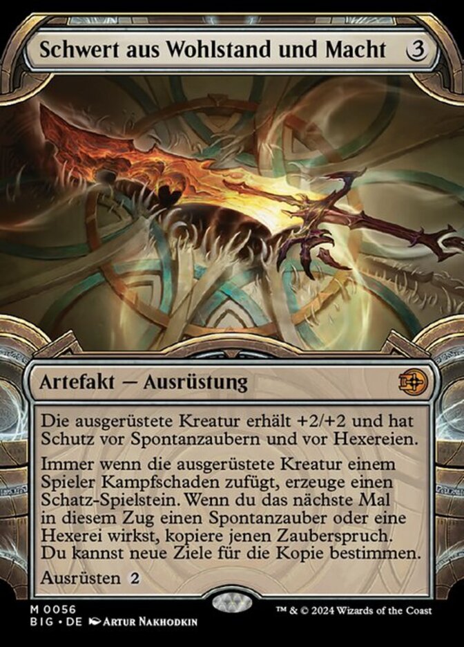 | Rules | Equipped creature gets +2/+2 and has protection from instants and from sorceries. Whenever equipped creature deals combat damage to a player, create a Treasure token. When you next cast an instant or sorcery spell this turn, copy that spell. You may choose new targets for the copy. Equip |