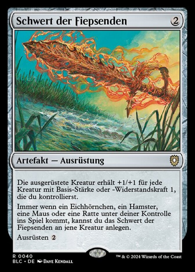 | Rules | Equipped creature gets +1/+1 for each creature you control with base power or toughness 1. Whenever a Hamster, Mouse, Rat, or Squirrel you control enters, you may attach Sword of the Squeak to that creature. Equip |