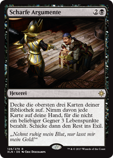 | Rules | Reveal the top three cards of your library. For each of those cards, put that card into your hand unless any opponent pays 3 life. Then exile the rest. |