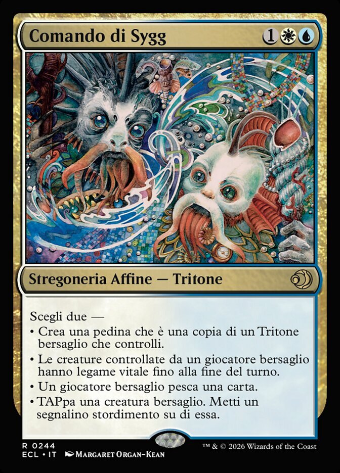 | Rules | Choose two — • Create a token that's a copy of target Merfolk you control. • Creatures target player controls gain lifelink until end of turn. • Target player draws a card. • Tap target creature. Put a stun counter on it. |