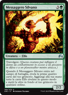 | Rules | Trample (This creature can deal excess combat damage to the player or planeswalker it's attacking.) When Sylvan Messenger enters the battlefield, reveal the top four cards of your library. Put all Elf cards revealed this way into your hand and the rest on the bottom of your library in any order. |